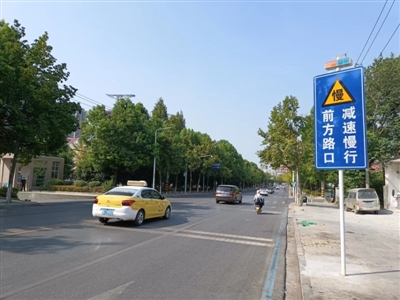 昨日下午,记者来到贺温路与青年路路口,看到“前方路口 减速慢行”的警示桩立在显眼的位置。路口斑马线处,也设置有醒目的标志,提醒过往行人和车辆注意安全。