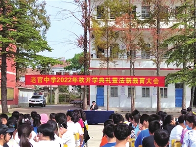 近日,在潘家湾镇老官中学2022年秋季开学典礼上,潘湾法庭负责人李博浪以法治副校长身份用以案说法的方式为全校师生们上了开学第一课。