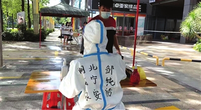 海南的天气时而骄阳似火,时而暴雨如注,天气又闷又热。入户做核酸的小区多数是老式居民楼,为早日实现清零,每一个入户采核酸的“大白”都需要克服体力和精力双重考验。8月中旬,邹纯洁在上门采样的时候,穿得密不透风的防护服一口气爬到6楼时,突然感觉快要虚脱了,这时一个稚嫩的声音轻声说道:“大白,你辛苦了,加油哦!”有点迷糊的邹纯洁瞬间打起了精神,元气满满的力量又回来了。