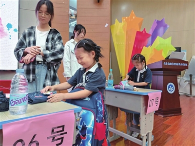 台上,小选手们紧张有序地将各类物品收纳进书包;台下,加油声不断。