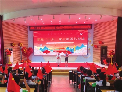 阶梯教室里,同学们以“喜迎二十大 我与祖国共奋进”为主题开展经典诵读比赛。作为活动的主会场,五年级组表演的《我骄傲,我是中国人》为比赛拉开序幕。在一阵阵掌声中,八个节目依次登台。他们或慷慨激昂,或低吟婉转,或热情奔放,或娓娓道来,稚嫩饱满地朗诵,与台下挥舞的小红旗相映成趣。比赛过程中,评委老师们从诵读内容、语言表达、舞台形式、仪表形象等方面为参赛节目打分。