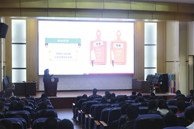 授课现场,王紫薇以进超市购买食材的排序开始讲座,并从科学购买食材、生熟食分开处理原则、烹饪加热要求、剩饭剩菜的处理、辨别假冒伪劣产品、安全膳食结构等方面,进行生动地讲解。面对常见的现象,同学们纷纷争相举手发言,活动现场气氛热烈。