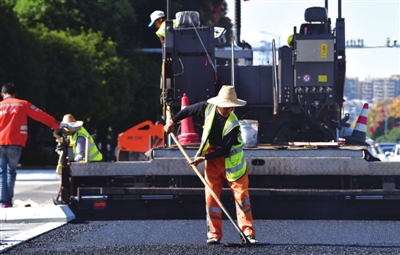 10月12日,市城区金桂路与银泉大道十字路口,工人们正在铺设沥青。 据了解,为缓解路口拥堵,提升道路通行效率,市城管执法委对城区多条主干道路口进行微改造。目前整体完工的堵点 16 个,正在施工中的9 个。