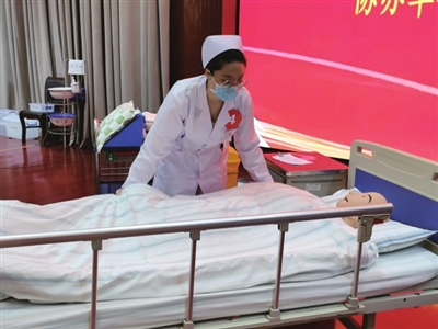 比赛内容为“压疮的预防及护理操作技术”。参赛选手由各参赛医疗机构通过层层选拔,严格挑选后选派。比赛流程:所有参赛选手于当天上午8点准时到达比赛现场进行抽签,经工作人员确认后,发给选手序号胸牌并在候考室等待上场参赛。同时,工作人员宣布比赛注意事项,然后选手根据自己抽取的序号从1号起按顺序进行参赛;评委老师现场打分,即去掉一个最高分和去掉一个最低分,取平均分为选手最后得分。