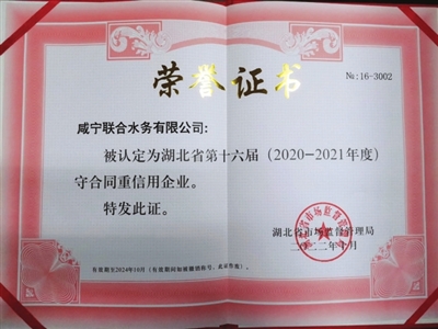近日,湖北省市场监管局公布湖北省第十六届(2020—2021年度)“守合同重信用”企业名单,咸宁联合水务有限公司顺利通过最终评审,获评该荣誉称号,这是咸宁联合水务继获得2018-2019年度省级“守合同重信用企业”荣誉后,再次蝉联该荣誉。