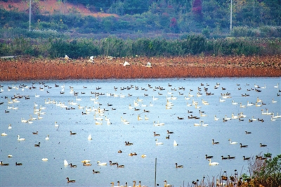 11月12日,赤壁市余家桥乡东港湖,数万只天鹅、大雁等候鸟在湿地里嬉戏、觅食。据了解,近年来,当地政府不断出台保护措施,随着生态环境不断地改善,来东港湖过冬的候鸟越来越多。 (通讯员刘克强)