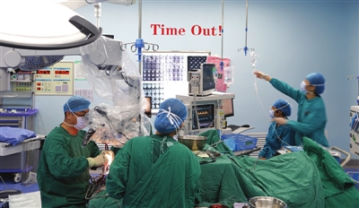 “患者来门诊就诊时,在其所出示的颅脑MRI上提示:患者脑部鞍区占位性病变,肿瘤已侵袭双侧颈内动脉、三脑室、侧脑室,脑室系统已轻度放大了。”咸宁市中心医院神经外科主任医师赵卫海告诉记者,接诊后,他立即为周先生完善了相关检查,最终以“鞍区肿物”将其收治入院。并立即将这一紧急情况向院长郭东生进行了汇报。