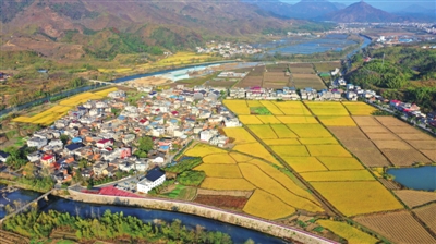 11月20日,通山县闯王镇汪家畈村,晚稻金黄,小楼错落有致,白云山霭缭绕,形成一幅美丽的田园画卷。