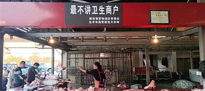 本报讯 (记者 见博 )11月19日,记者来到亿丰农商货批发大市场,走进肉类贩卖区看到:门口的一家店铺被挂上了“最不讲卫生商户”的牌匾,十分“辣眼”。