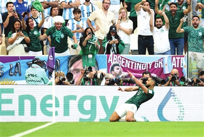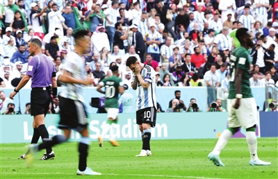 本报综合消息 终场哨响,梅西落寞地走向球员通道。在他身后,沙特阿拉伯队的球员们尽情拥抱欢庆。一球领先的局面下,夺冠热门阿根廷队在这个北半球的冬天被沙特队5分钟内连进2球逆转。