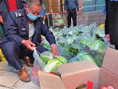 本报讯(记者 黄兰芬)11月26日下午,在浮山街道香城社区书苑小区,咸宁市新联物业公司为小区十六栋一单元37户配送免费蔬菜,为封控业主送温暖。