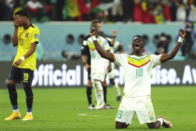 另一场比赛踢得更加激烈,只有取胜才能确保出线的塞内加尔队孤注一掷,不断利用速度冲击厄瓜多尔队的防线。第43分钟,塞内加尔队前锋萨尔打入点球,帮助球队领先。下半场比赛,打平就能出线的厄瓜多尔队全力进攻,利用角球机会由小将凯塞多在第66分钟将比分追平。不过,塞内加尔队3分钟后就由中后卫库利巴利在混战中破门,再次反超比分。最后时刻,塞内加尔队顶住对手猛攻,以一场胜利晋级16强。