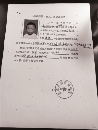 请孩子的亲生父母或者其他监护人持有效证件与王女士联系,联系电话0715-2358818,联系地址:湖北省通山县城市福利院。即日起60日内无人认领,孩子将依法安置。