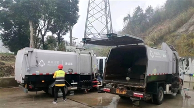 在垃圾压缩车回站后,作业人员清扫车辆出渣口、接渣口等关键部位,保证压缩车二次出站依旧干净整洁。待到晚上一天清运作业完毕后,垃圾压缩车则要“洗洗澡”,车厢、车身、排污管等全方位清洗清洁。