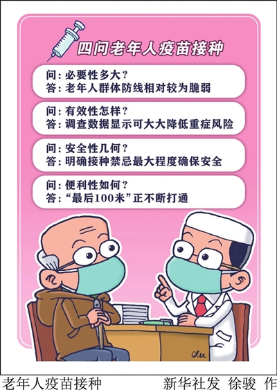 设立老年人绿色通道、临时接种点、流动接种车等;选派诊疗和接种经验丰富的医务人员组建接种小分队,携带接种后观察期间所需要的常用设备和药品,为失能和半失能老人提供上门接种服务……多地正在按要求优化各项便民措施,打通老年人接种“最后100米”。