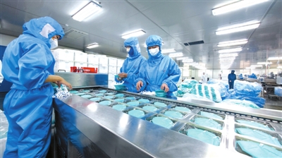 12月15日,咸宁高新区金士达医疗(咸宁)有限公司生产车间内,各条生产线火力全开、满负荷运转。 该公司产品囊括医用口罩、外科口罩、防护服、手术衣等,目前每日可生产医用防护服4万件、医用N95口罩四五十万只、医用平面口罩200万只。 (成昱勋/摄)