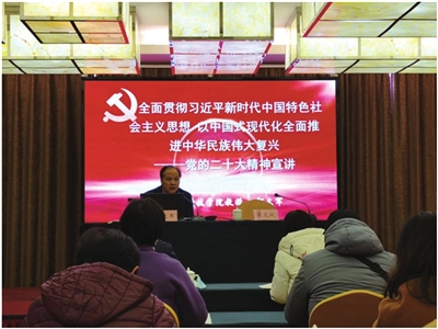 专题宣讲会上,鄢文军以《全面贯彻习近平新时代中国特色社会主义思想 以中国式现代化全面推进中华民族伟大复兴》为题展开宣讲,他从“灵魂红线——深刻领会大会的主题、自信底气——深刻领会新时代十年的伟大变革、理论创新——深刻领会中国化时代化马克思主义、现实路径——深刻领会中国式现代化发展道路、团结要求——深刻领会共圆中国梦的强大合力”五个方面进行讲述,围绕党的二十大主题、指导思想和主要成果,深入浅出地阐述了党的二十大报告的精神实质。