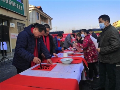 活动现场,数百名群众把董继宁美术馆志愿者书写台围得水泄不通。“我家儿子今年刚成家,春节要回老家过年,请帮我写个阖家欢乐的对联。”村民王女士乐呵呵地向书法家说道。