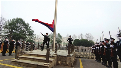 “升旗仪式现在开始!”昨日是第三个中国人民警察节。上午8时30分,在市公 安局门口,全体民警身着警礼服,英姿勃发、列队整齐。伴随着洪亮的口号响彻云霄,护旗 方阵队员们目光坚毅,踏着坚定的步伐、整齐划一地护卫着警旗迈向升旗台。随着威严的 《中国人民警察警歌》响起,警旗迎着旭日的光辉冉冉升起!