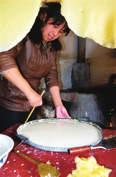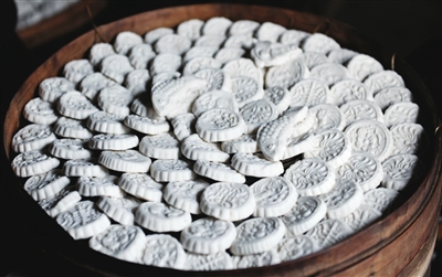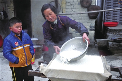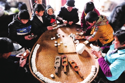 做传统美食是一连串的室内活动,因有多种美食要做,都是为过年准备的,主要有做粑崽,也就是年粑,再就是漏薯线粉、炒米爆、打豆腐、烫粉皮,都非常忙碌,也十分热闹,是必不可少的节前活动。年粑,是由大米舂成粉后和着水揉成软坨子放进粑印捺制而成的,正面有花纹图案,都是一些吉祥物和祝福的字词句。做年粑是参与人数最多的做美食活动,特别是在印年粑的时候,是男女老少一起上,时间也比较紧凑,几乎是需要一气呵成,做出的年粑可蒸着吃,可煮着吃,可烹着吃,可烧着吃,可煎着吃,也可烤着吃,是春节必不可少的传统美食。