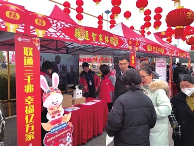 “妈妈,快看,这里的大屏幕演示好有趣呀!在元宵节庙会联通智家体验区前,一位小女孩拉着她的妈妈驻足观看,不时传出惊叹的声音,吸引了众多市民前来体验。