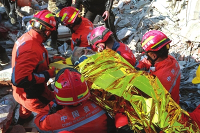 救援队员为获救者盖上特制的金色保暖薄膜,防止他继续失温,然后抬着他小心翼翼穿越废墟。齐心协力把获救者转移上救护车后,两国救援队员们不约而同鼓掌、握手、拥抱,互相竖起大拇指。