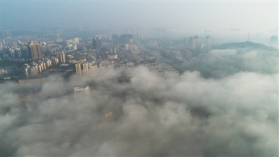 2月15日清晨,咸宁城市上空云雾缭绕,在朝阳的映衬下,高楼、远山在雾中若隐若现,壮丽缥缈,宛如人间仙境,美不胜收。