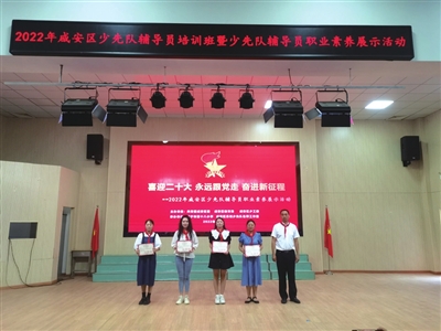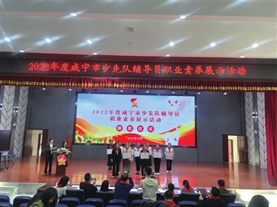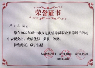同时,该校注重辅导员队伍建设,连续几年,在咸宁市辅导员素养大赛中,有多名辅导员老师在职业素养展示活动中斩获佳绩。去年,乐知少先队名师工作室成员郑亚文老师在区级和市级比赛中均荣获一等奖,中队辅导员刘添情老师在区级比赛中荣获二等奖的好成绩,郑亚文还代表咸宁市参加湖北省辅导员素养大赛。
