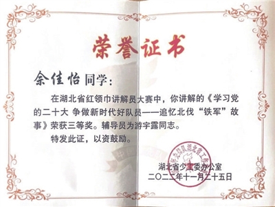 游宇露个人荣誉的获得,离不开一个优秀的集体。咸宁市第十八小学一直秉承少先队工作优先的治校特色,于2018年成立少工委。在党建引领下,该校少先队工作全面夯实思想政治引领、着力规范少先队组织建设、不断增强少先队员光荣感和归属感。引导广大少先队员,从小学习做人、从小学习立志、从小学习创造,切实加强了少年儿童思想品德教育、创新精神与实践能力的培养,努力完善少先队的基础建设,全面提高了队员素质。