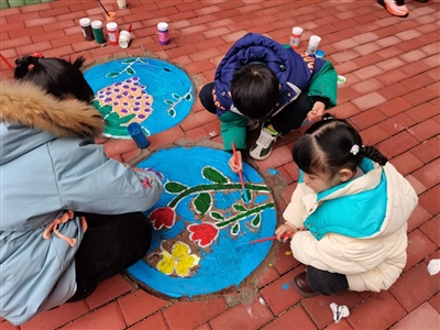 经过刷底色、铺背景、勾轮廓、填色等一道道工序,鲜艳的花朵、可爱的米奇、梦幻的月亮、亮晶晶的葡萄等趣味手绘跃然于井盖上,“灰头土脸”的井盖瞬间逆袭成为“萌萌哒”的“艺术品”。