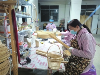 2月15日,位于咸安高铁站附近居民小区的竹艺加工坊,四位女工围坐在长桌旁,熟练地将烫金的红色薄丝绢扇面糊在圆形的扇框上,点缀上枝形的珍珠,将扇坠穿入团扇尾柄处的圆孔中,一把美轮美奂的中式喜扇出现在我们面前。