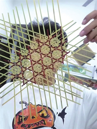 一群学生围坐在长桌前做竹编。柳燕子拿了28根宽1厘米的竹篾顺着矿泉水按等距排好,再用橡皮筋箍上两道,扎紧之后,双手一穿一拉,一条条分散的竹丝在她指尖轻松“玩转”,分分钟就起好了平安扣底。