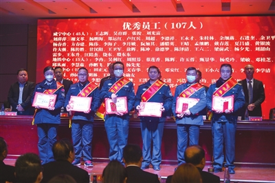 大会中,兴安集团对完成2022年度各项任务成绩突出的18个“先进集体”和260名“先进个人”予以隆重表彰。先进代表们身披绶带,昂首阔步走上领奖台,接受颁奖和参会员工的致敬。