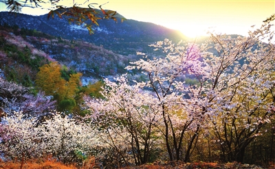 这些樱花树树龄约有五、六十年,粗壮些的树身有2尺围。樱花散落在山野之中,一团团、一蓬蓬,或粉红,或淡紫,或雪白,路边有它的艳容,山头有它的娇姿,山谷有它的倩影。、远近高低,山头朦胧成一片花海。近万株野樱花树织成绚烂锦绣,如画美景一直持续至4月中下旬。