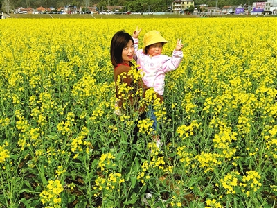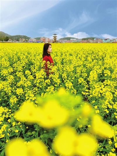 只见静静流淌的高桥河畔,金色的油菜花连成一片金色的海洋。游人们三五成群,有的沿着步道欣赏沿途的田园美景,有的迈入花田拍照留影。远远望去,菜花、游人、民房构成一幅精美的乡村水彩画。