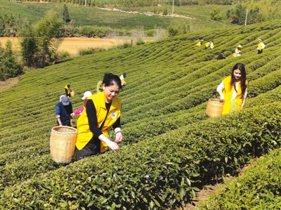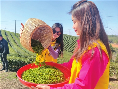 春回大地,茶叶飘香。3月13日,赤壁茶发集团果茶公司中伙铺镇娘娘山茶叶基地生机盎然,采茶工们穿梭在茶园中,十指翻飞,采摘一颗颗嫩芽。目前,该茶叶基地已发展3000余亩,一天可采摘700余斤茶叶鲜叶,给周边200余名农户带来180元至300元不等的收益。