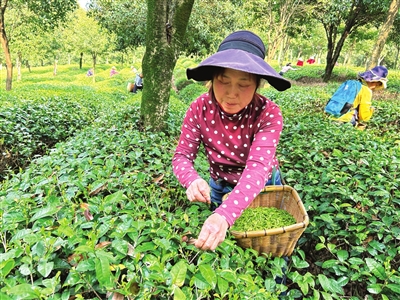 在桂树成荫的汀泗川玉有机茶生态茶园,数十位茶农腰挎竹篓,穿梭在茶树间娴熟地采摘鲜嫩的茶芽。茶园一角,有着25年茶叶生产管理经验的朱祖元,正对几名今年新加入的采茶工进行业务培训。只见他一边示范采茶的正确手法,一边讲解茶鲜叶验收的质量标准和茶叶采摘要求等,“要选取芽头壮实、饱满,一芽一叶初展的茶叶。采摘时要用手腕的巧劲,不能用指甲蛮掐,这样后期生产的茶叶,品相和滋味才有保证,茶价才卖得好。”