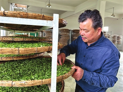 走进清洁自动化的茶叶生产车间,张加川的爱人朱金玉正指导工人对刚收获的茶鲜叶进行摊青。她告诉记者,工人首先要对收回来的鲜叶进行初选,挑出脚叶、残次叶等。茶叶摊青的时间,包括后续的炒制,都要根据当天的温度、湿度,以及茶叶本身的水分含量去作适当的调整。