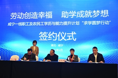 3月31日,记者从咸宁一线职工及农民工学历与能力提升计划“求学圆梦行动”启动会上获悉,市总工会将联合湖北第二师范学院、荆楚理工学院和省求学圆梦行动服务中心,为我市广大一线职工和农民工圆“大学梦”。