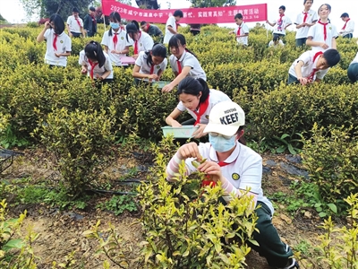 在茶园,茶叶专家指导学生们认茶、寻茶、采茶。同学们穿插在茶树之间,弯着腰,认真观察、摘取茶树上鲜嫩的叶片,放进茶篓中,一拈一摘,构成了一道亮丽的风景。专家边讲解边示范,悉心指导下,同学们的采摘手法和速度大大提高,大家体会劳动快乐的同时,还收获了一大竹匾新鲜茶叶。