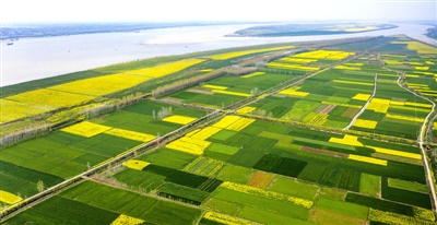 仲春时节,嘉鱼县鱼岳镇护县洲村春意盎然,金黄油菜怒放、绿油油小麦抽穗、白色地膜里幼苗出芽,一条条彩带把大地描绘得色彩斑斓。