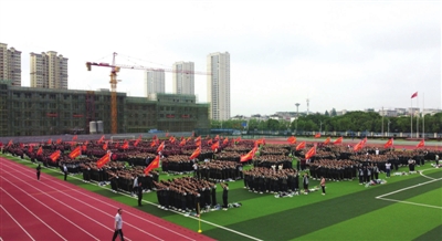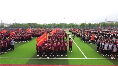 哨声响起,63个班级的学生,身着校服、步伐整齐,伴随着音乐的节奏,激情跑动。“高一高一,勇争第一”“顽强拼搏,斗志昂扬”……此起彼伏的口号声、整齐划一的步伐声在田径场上回荡。