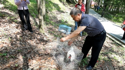 5月9日,通城锡山城市公园山林内,通城县林业局工作人员将国家二级保护动物白鹇、猫头鹰放归自然。