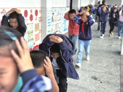 演练前,学校制定了详细的防震疏散演练方案,随着第一波防震演练警报在学校上空响起,任课老师们立即指挥学生用双手护住头部、闭眼、躲在各自的课桌下;当第二波警报响起时,全体教师指导学生用手抱头、弯腰低身、沿着预定路线,快速有序地撤离教室。从教室到安全地点共用时2分40秒,全校师生全部安全疏散完毕。