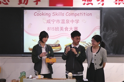 本报讯(记者 熊大平 通讯员 郑伟)“通过制作三明治,看似简单的食物,也需要耐心研究”“每一道美食,都是学习实践的成果,也让我们感受到在体验中学习的乐趣”……5月12日早上8点,温泉中学2021级(15)班教室内热闹非凡,香气扑鼻。这是该班的美食节现场,每个人学做一道美食,以小组为单位、运用英语课本所学知识分享制作方法以及个人感受。英文的介绍方式,让这场分享会更多了一些创意。
