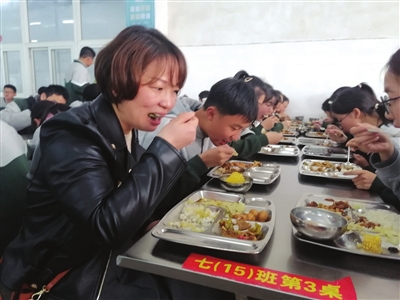 孩子在学校吃得怎么样、食堂菜品是否干净卫生?……孩子们在校的就餐情况牵动着每一位家长的心。近日,在通城县隽水初中餐厅内,七(15)班家长代表与学生共同进餐。