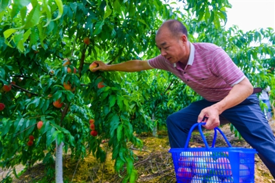 5月30日,咸安区向阳湖镇广东畈村尚屋朱农果园内,前来游玩的市民们游走于桃树林,开心地采摘着刚刚成熟的桃子。
