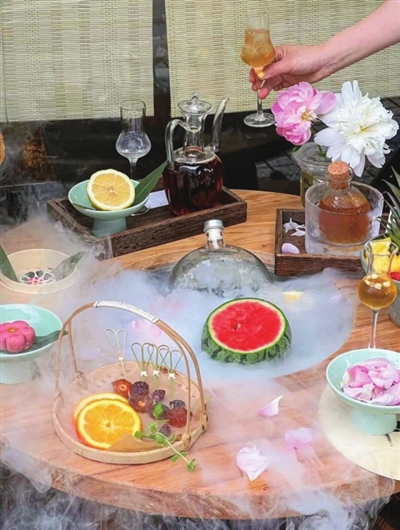 将炭火换成干冰、热茶换成冷泡茶、烤橘子换成冰淇淋,一场“云雾缭绕”的“围炉冰茶”就准备好了——围炉冰茶让围炉煮茶的热度在夏季得到延续。冰桶、冷萃茶的组合加上干冰这一“氛围组”成员,打造出一套高颜值、凉感“拉满”的夏季下午茶套装。这也让“围炉冰茶”一下子成了新晋网红。