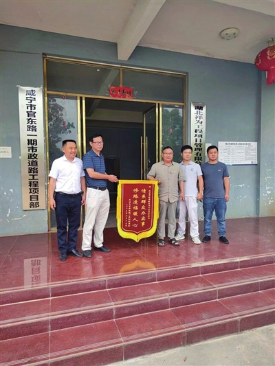 官东路的修建,得到官埠桥镇小泉村众多村民的好评,一组和六组共400多位村民直接受益。6月12日,咸安官埠桥镇小泉村党总支书记沈晓平代表村民,到官东路一期工程项目部,为市政府投资项目建设管理局送上锦旗,锦旗上面写着“情系群众办实事,修路造福暖人心。”