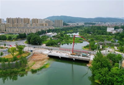 6月12日,位于市区咸宁大道与龙潭河交叉口的兴龙桥拓宽工程施工现场一派繁忙,工人顶着高温抓紧施工。